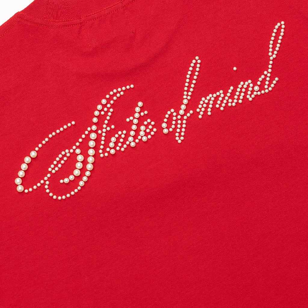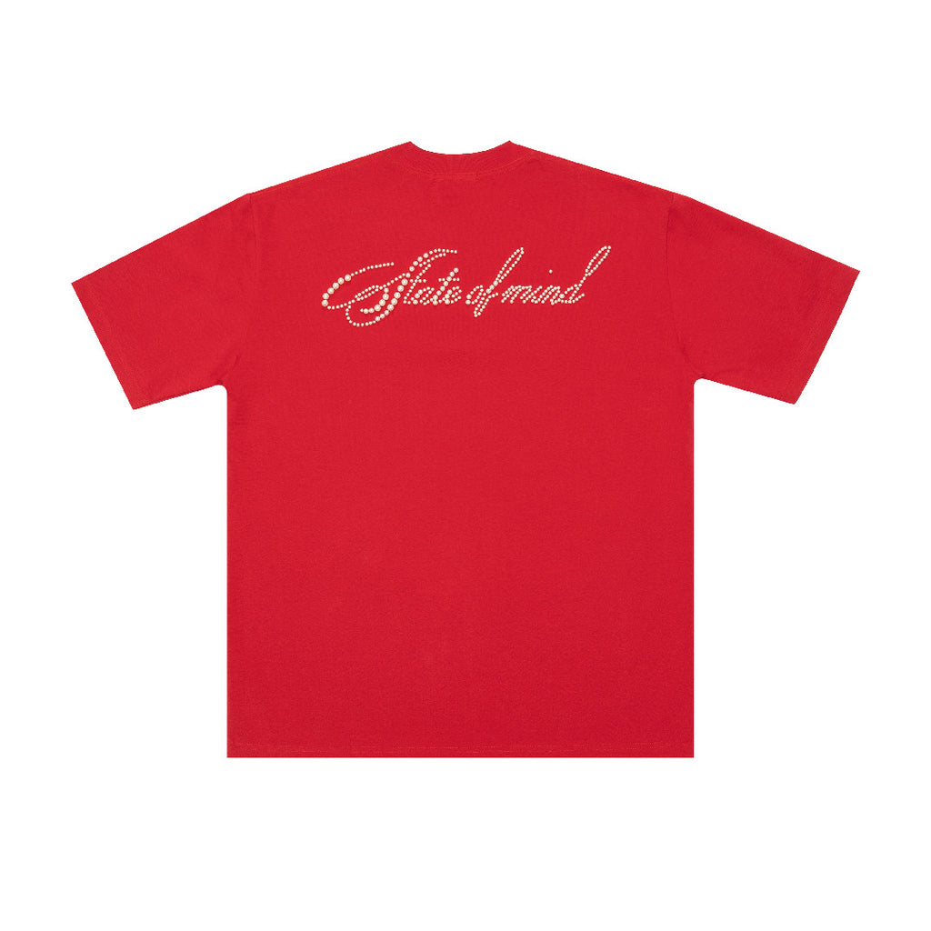 Inspired from the color of passion, power, and the hustle. This piece takes that energy and refines it with the beauty of the pearl. A 360-degree masterpiece of colour, texture and light. The front showcases the Stoned Cursive logo, meticulously stitched with high-standard pearl beads that shimmer against the deep red background. The back continues the narrative with the State of Mind cursive logo, ensuring that your creative expression is visible from every angle.